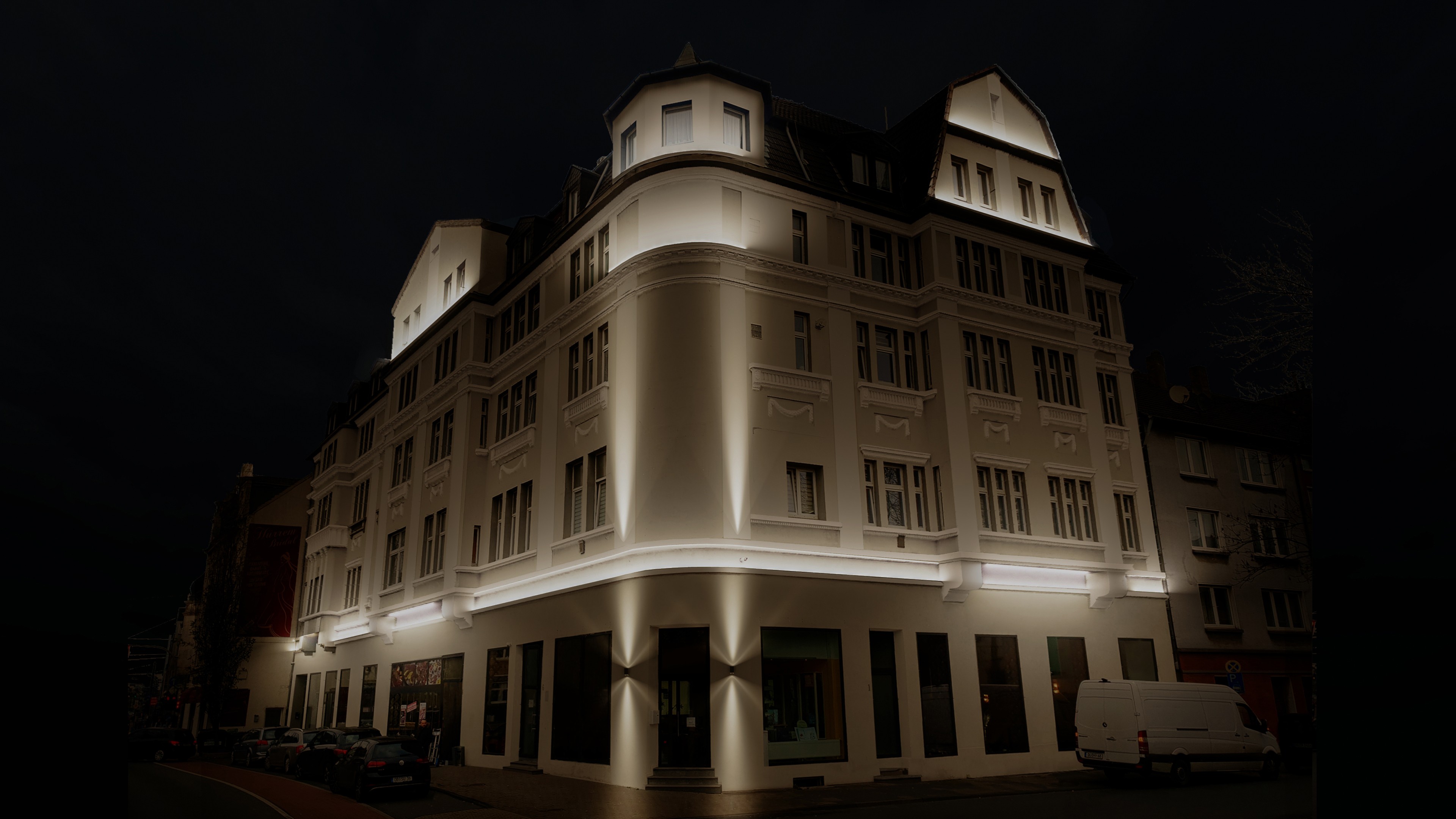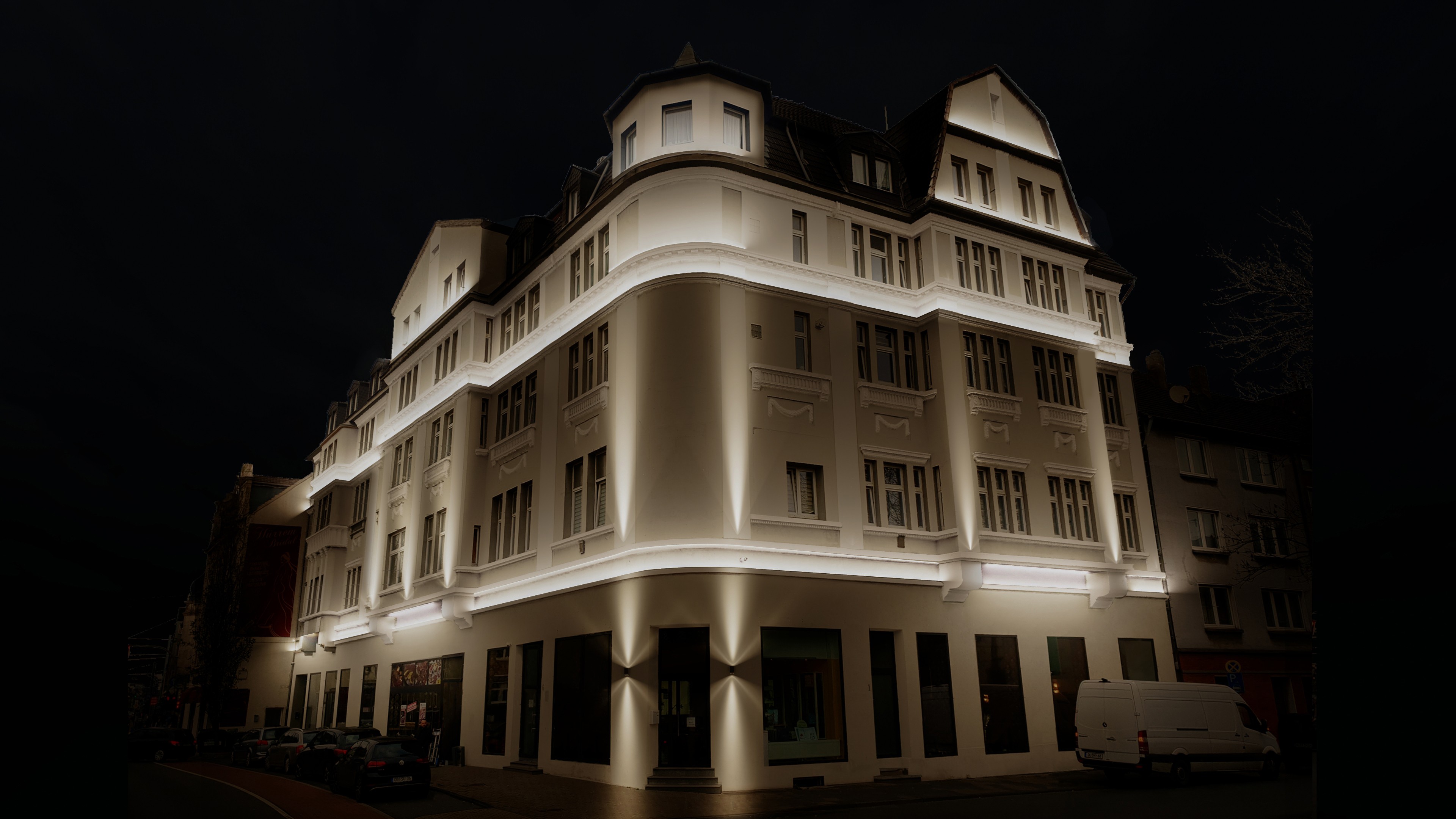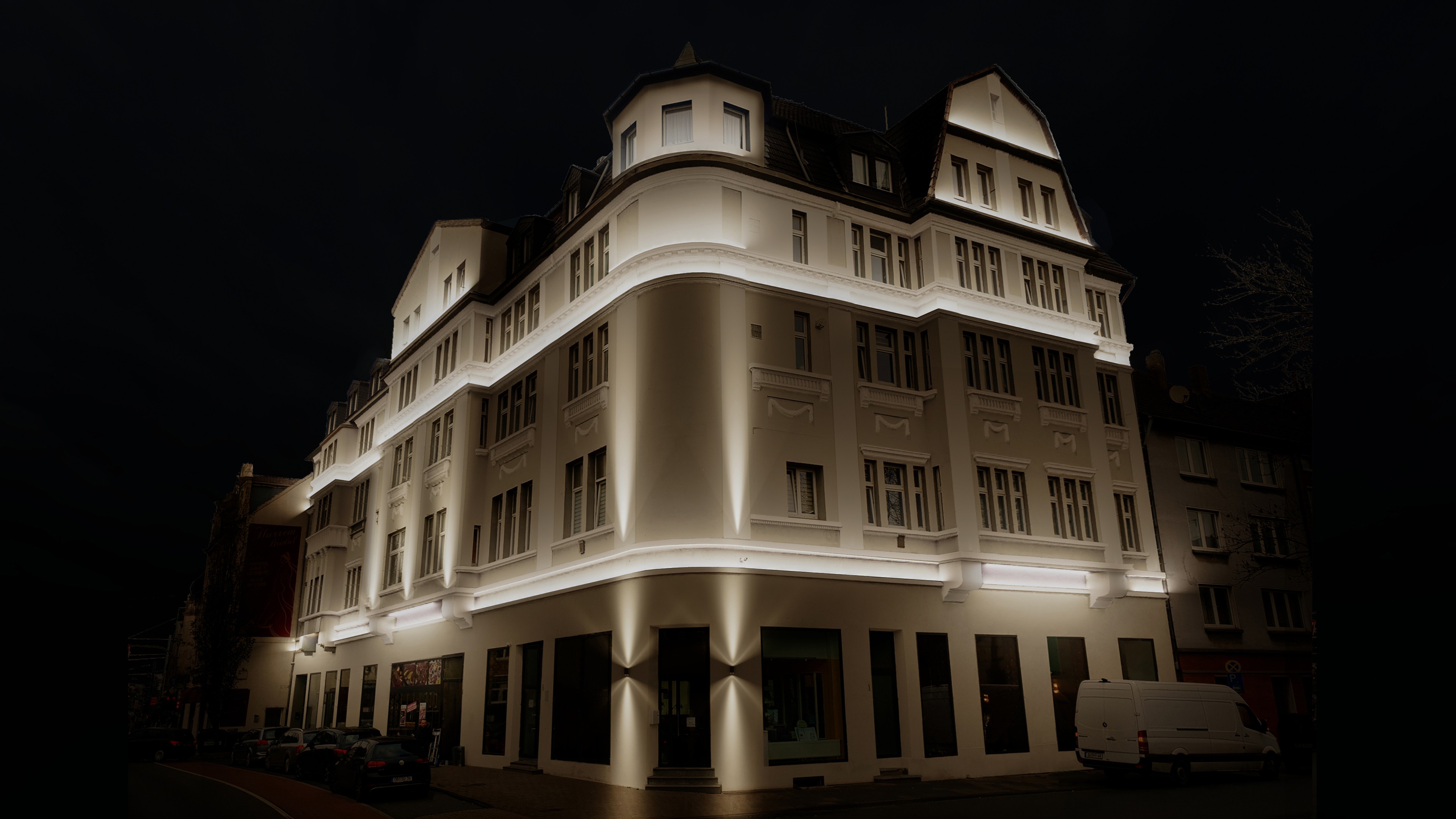 Die Lichtgestaltung folgt der bestehenden Architektur. Horizontale Linien, Gebäudekanten und Fassadenvorsprünge werden gezielt betont, während vertikale Akzentuierungen die Höhe und Struktur des Baukörpers unterstreichen. So entsteht eine klare Lesbarkeit der Fassade, ohne sie zu überinszenieren.
