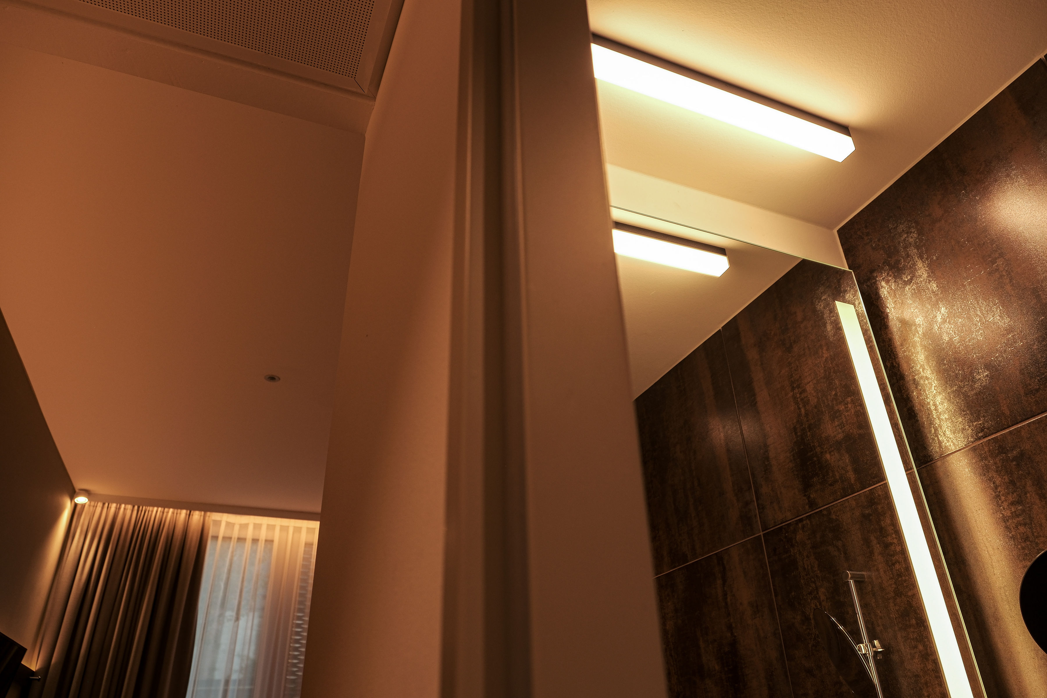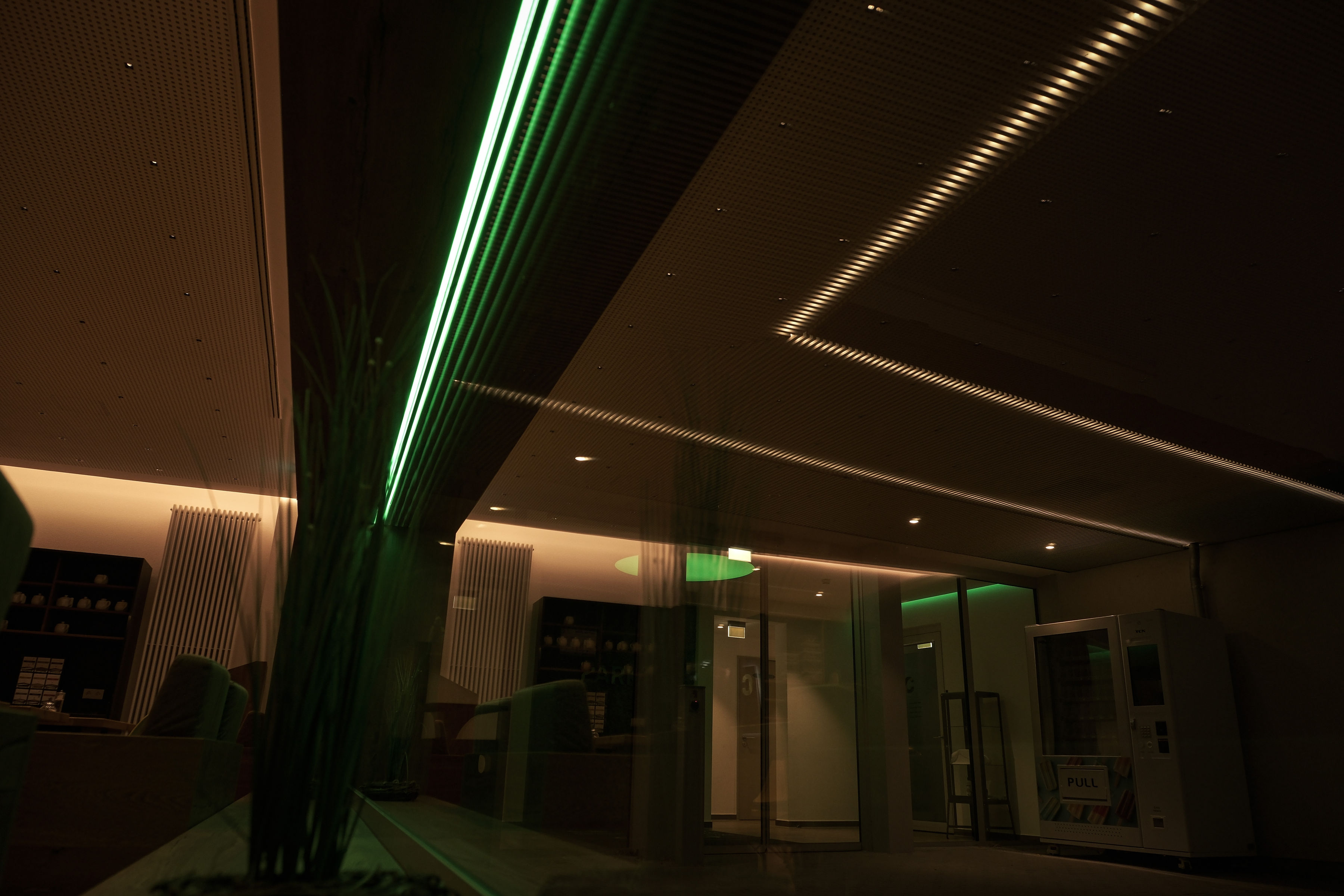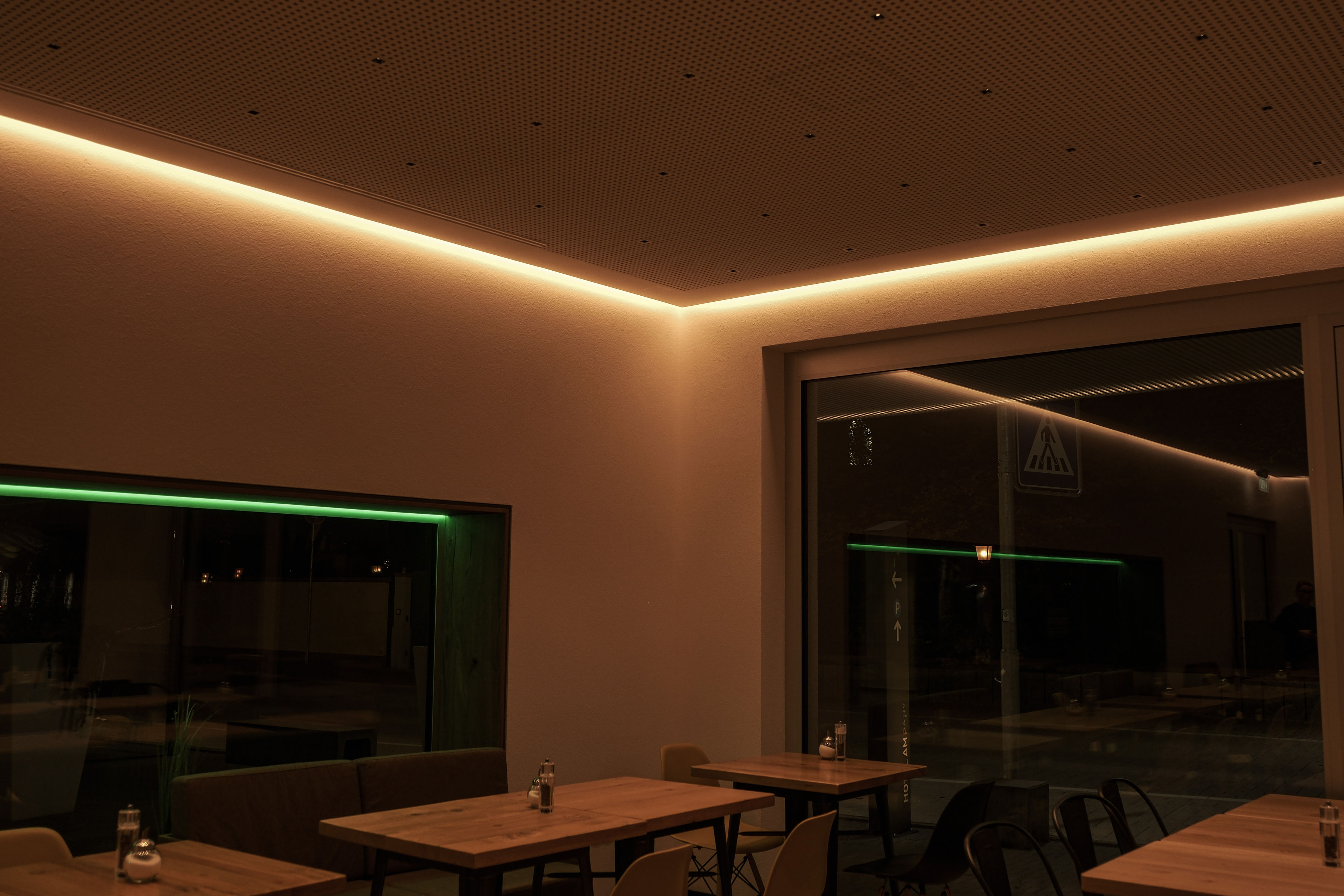 Subtile Lichtelemente setzen künstlerische Akzente und ermöglichen unterschiedliche Nutzungssituationen – vom Ankommen über Abendbetrieb bis hin zu Events.