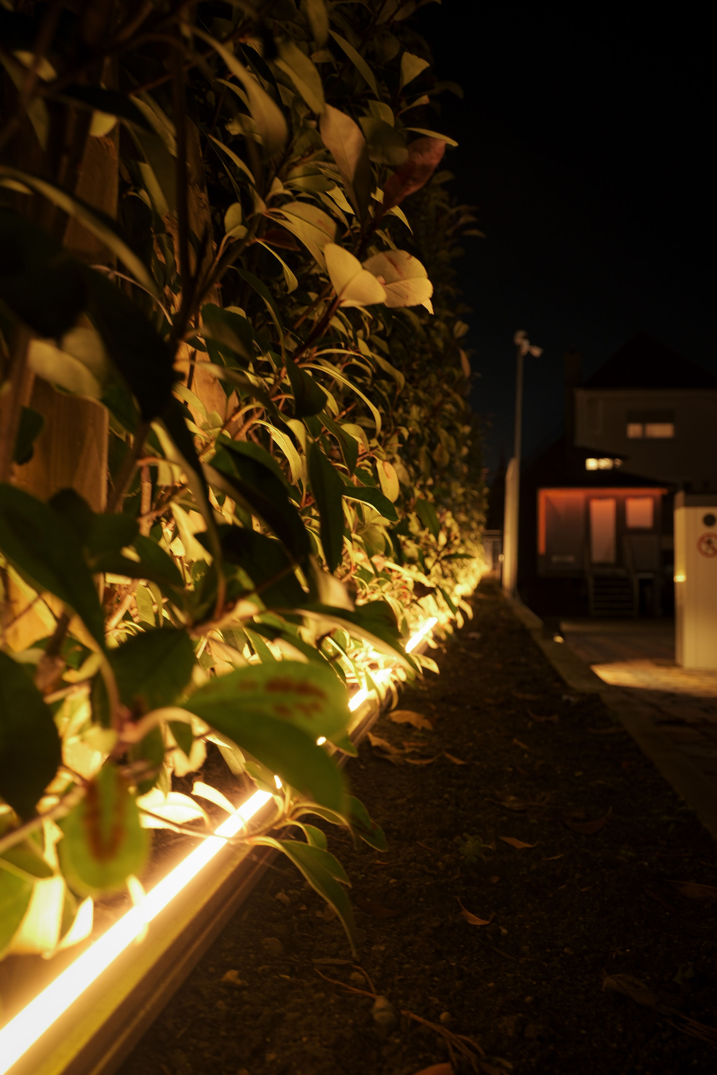 Warmtonige Strahler schaffen Tiefe, heben Pflanzen- und Materialstrukturen hervor und erzeugen ein einladendes Ambiente für Gäste und Besucher.Funktionale Wege- und Orientierungsbeleuchtung